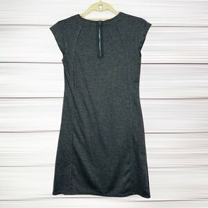 Beautiful charcoal grey mini dress with cap sleeves, 1/4 zip back closure and multiple prints on the front.