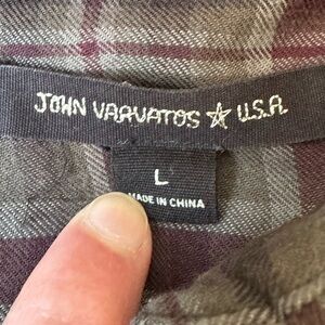 John Varvatos Star USA olive & burgundy plaid super soft cotton blend long sleeve shirt. Shirt has unique zipper chest pockets and roll tab sleeves.
