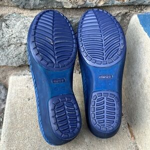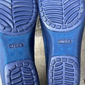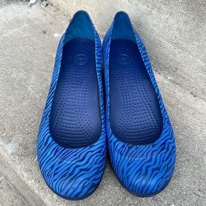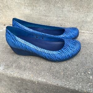 Crocs Carlisa Blue Animal Zebra Print Mini Wedge Slip On Shoes size 10 in excellent like new condition. No flaws. No scuffs, scratches, or stains to the upper and the bottom of the shoe.