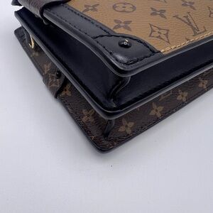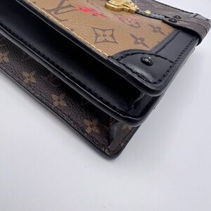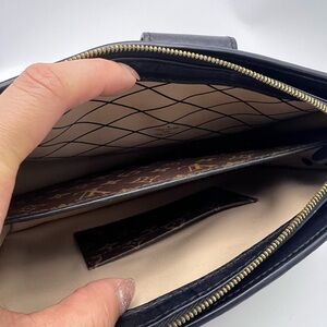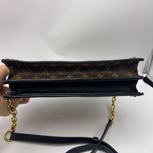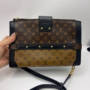 Stylish brown and black clutch with monogram design. Features gold accents and a secure clasp. Perfect for any occasion.