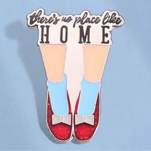 Charming enamel pin with a 'There's No Place Like Home' design. Features red, blue, and black colors.