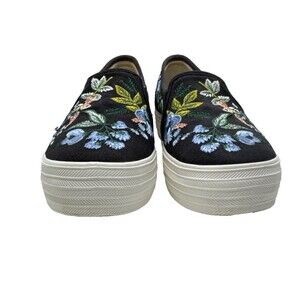 The Keds x Rifle Paper Co. Black Floral Embroidered Slip-on Sneakers in size 7 are a stylish and comfortable choice for women looking for a versatile shoe.
