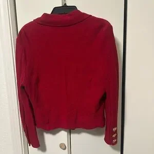 Chic blazer in vibrant scarlet. Features elegant gold buttons double breasted. Perfect for a polished look.