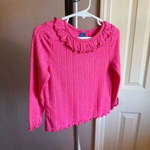 Brighten any day with this adorable NWOT Old Navy knit sweater shirt. The vibrant pink hue and delicate pointelle knit pattern create a charming look, while the playful ruffled neckline and lettuce hem add a touch of sweetness. Perfect for everyday adventures or special outings, this comfortable top will have your little one feeling stylish and happy. Dress her in this for a park playdate or a family brunch.