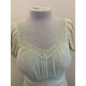 Very pretty delicate 1960s vintage retro light mint green full length slip nightgown. Mid century has pretty lace details and cap sleeves, deep v neck and gathered at the bust. Brand is Charmode from Sears. Size 34 has stretch, fits like modern medium or small.
