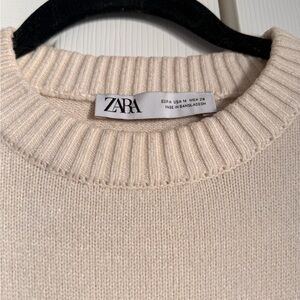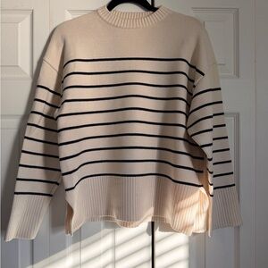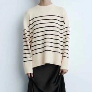 Chic Zara sweater with bold stripes. Soft cream and black design. Perfect for layering.
