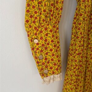 Vintage 1970s Fritzi of California. Embrace elegance with this floral yellow long sleeve dress. Perfect for any occasion, this dress combines style and comfort effortlessly. Lace detail and brass buttons. Excellent condition.