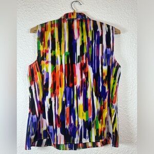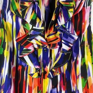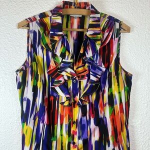 Stand out in bold style with this vibrant blouse from Tahari Arthur S. Levine. Featuring a sleeveless cut with a ruffle-trimmed neckline and button-down front, this piece combines elegance with a playful burst of color. The multicolor abstract print makes it perfect for work, casual chic, or layering under a blazer.