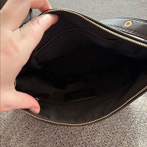 Elegant Coach shoulder bag with signature pattern. Tan and brown tones. Ideal for everyday use.