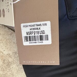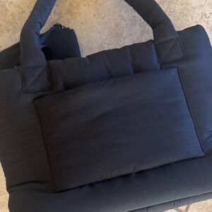 Stylish black puffer tote bag with matching pouch. Features a comfortable handle and sleek design. Slides onto carry one luggage handle