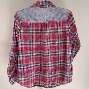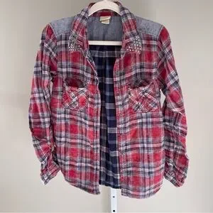 Stylish Daytrip red plaid button-up shirt in size Large. Features a soft 100% cotton fabric with a chambray yoke detail, studded embellishments on the collar, and roll-tab sleeves for a versatile look. Button-front closure with dual chest pockets adds a classic touch. Perfect for casual wear or layering.