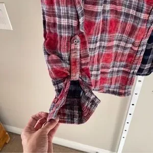 Daytrip Red Plaid Button-Up Shirt L Studded Collar Chambray Yoke Roll Tab Sleeve