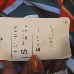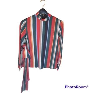 Muriell's Closet blue, red, green, gold, tan and white striped blouse. Size small. Rounded collar. Blouse is from maker Tian Fu En. Attached is a belt that can tie into a bow at the waist. Gold zipper on the back.. Measurements attached.