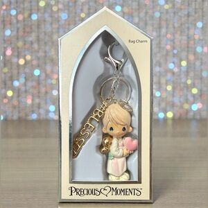 Charming Precious Moments keychain/bag charm. Features an adorable figure with a pink heart and a gold 'Blessed' charm.