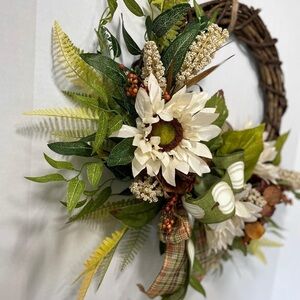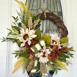 Welcome the beauty of autumn into your home with this Rustic Fall Sunflower & Pumpkin Wreath by dianeswreathshop. Handcrafted on a sturdy 14-inch grapevine base, this wreath features vibrant faux sunflowers, lush greenery, delicate white pumpkins, and charming plaid ribbon accents—capturing the warmth and coziness of the harvest season. Berries and rustic textures add an elegant farmhouse touch.