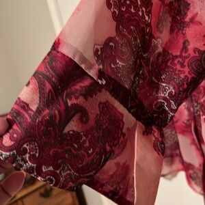 Women’s size 22W/24W sheer 3/4 length sleeve shirt by George. Is like new. Has beautiful bright colors with button down front and sleeves are no button, open with a slit at the bottom for comfort and style.
