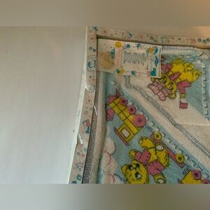 Wrap your baby in this sweet vintage bath towel set featuring a delightful bear and train design.