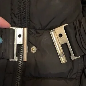 Chic black puffer coat by Betsey Johnson. Features quilted sleeves and button details. Stylish and warm. One sleeve does have white paint on it. Good condition no holes. Does have a belt around coat. Black.