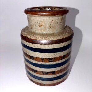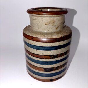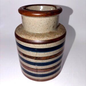 Beautiful vintage ceramic spice jar / canister featuring a timeless eclectic, retro, and Scandinavian modern design. This piece showcases earthy neutral tones with blue and brown horizontal striping, giving it strong mid-century modern and mod appeal.