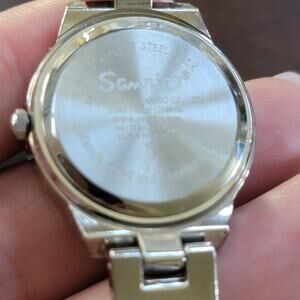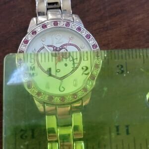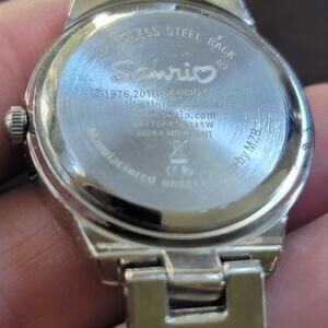 Add playful charm to your wrist with this adorable Hello Kitty wristwatch. The silver-tone metal bracelet is paired with a matching round case, approximately 1.25 inches in diameter. The watch face features a whimsical Hello Kitty graphic inside a pink heart, surrounded by sparkling pink and clear rhinestones along the bezel. Silver-tone hour markers and hands complete the fun yet elegant design. The metal link bracelet closes with a fold-over clasp and fits most women’s wrist sizes comfortably (see photos for measurements). Battery-operated and currently in working condition, this quartz watch is perfect for Hello Kitty fans of all ages. A delightful gift or collectible item that combines childhood nostalgia with wearable fashion. This water-resistant quartz watch is battery operated and in working condition.