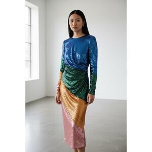 Dress the Population Sequin Color Block Long Sleeve Midi Sheath Dress XS NWOT