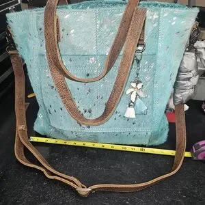 Elevate your style with this chic American Darling turquoise dyed hair on hide with shimmery splatters tote bag. Featuring elegant brown leather accents, straps, and base this bag is perfect for any occasion. Its spacious design and unique charm make it a must-have accessory.
