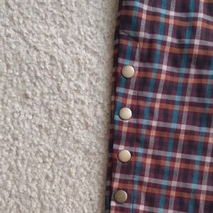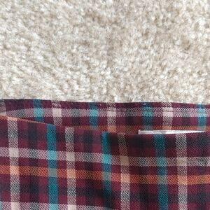 Menswear style slim leg pants in a pretty autumn brown/orange/teal plaid. Pull-on styling with bronze tone button detailing at cuffs. Rayon/poly/span. Never worn. Approx 17" across waist, 12.5" rise and 27" inseam