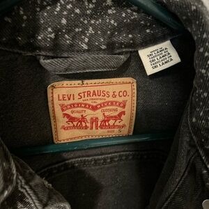 Levi's denim jacket with a gray base and white speckled pattern. Features classic button-up design. Perfect for a night out or holiday party, great gift for a loved one as well!