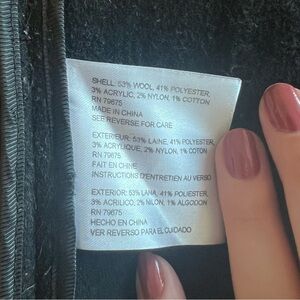 SHELL. 63% WOOL, 41% POLYESTER, 3% ACRYLIC, 2% NYLON, 1% COTTON