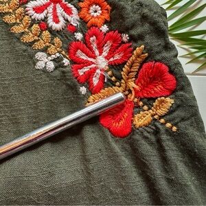 Gorgeous olive green Saachi tunic featuring vibrant floral embroidery along both sides and a half-button front with matching embroidered buttons. Long sleeves with button cuffs and convenient side pockets. Flowy, lightweight, and perfect for a boho casual look.