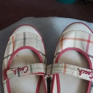 Charming Coach Mary Jane shoes with a plaid pattern. Features pink accents and a secure strap. Perfect for stylish outings.
