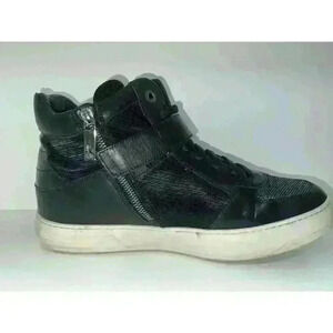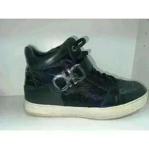 These Salvatore Ferragamo high-top sneakers blend style and comfort effortlessly. The black leather and mesh upper provide a modern, edgy look, while the signature Ferragamo hardware adds a touch of luxury. The cushioned insole ensures all-day comfort, and the durable rubber outsole offers excellent traction. Ideal for enhancing your casual or semi-formal outfits, these sneakers are a must-have for any fashion-forward individual.