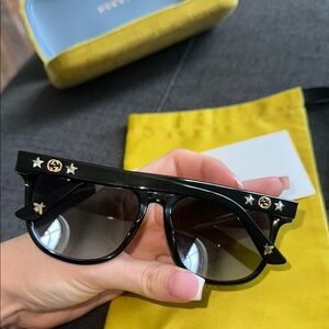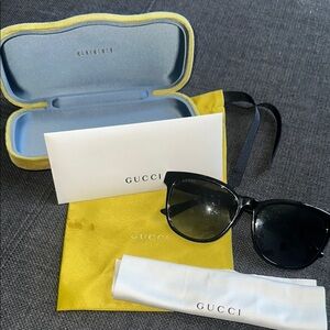 Elevate your style with these chic black sunglasses from Gucci. Perfect for any occasion, these sunglasses offer both fashion and function. Worn once time includes everything in photo 100% authentic small mark on dust bag