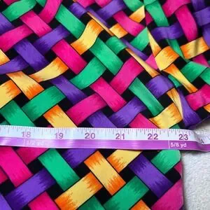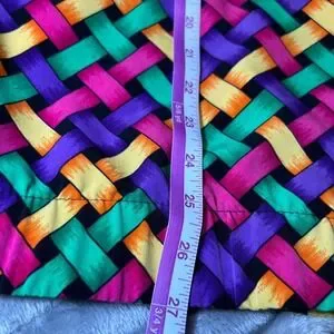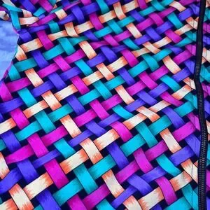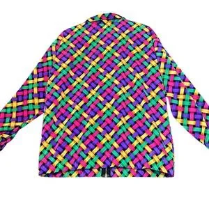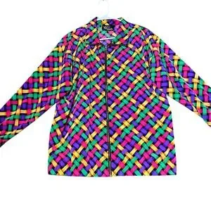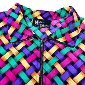 Keywords: Silver Threads LTD, Woven Print Jacket, Geometric Print, Zip Up Bomber, Women's Jacket, Medium Size, Polyester, Made in USA, Vintage, Retro, Colorful, Bold Print, Statement Jacket, Lightweight Jacket, Casual Wear