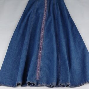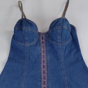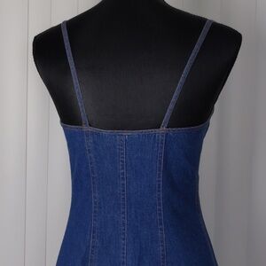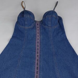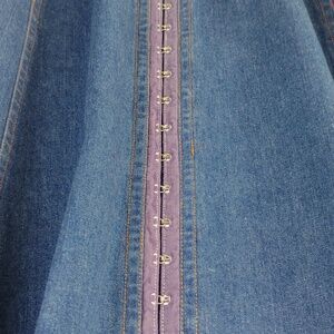 Versatile 100 % cotton denim dress perfect for any occasion. Features front hooks closure top to bottom with contrasting lavender color material. Thin shoulder straps. Its sleek design and rich color make it a must-have in your wardrobe.