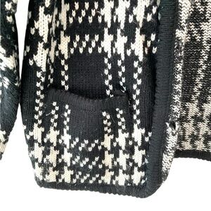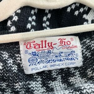 Vintage Tally Ho knit cardigan sweater • Black and white plaid pattern • Button front with silver-tone buttons • Two front pockets • Long sleeves • Measurements: pit to pit approx 20”, length approx 20”, sleeve length approx 17” • Note: Small seam reinforcement needed at top edge of left pocket (easy fix, shown in photos) • Acrylic knit • Gently preowned from a smoke-free home
