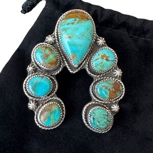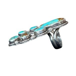 A stunning handmade silver ring inspired by Native American design, crafted by the renowned artist CB Gems. This beautiful piece features multiple turquoise stones set in a detailed sterling silver band, showcasing craftsmanship and artistry.