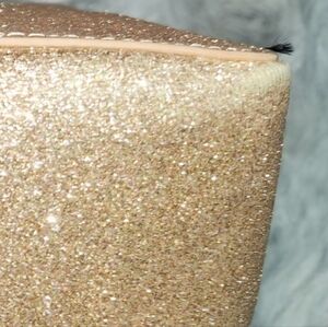 This bag features a glitter fabric with saffiano PVC trim, rose gold / light pink in color with gold-tone zipper hardware. The double top handles are light pink in color. The Interior contains a fabric lining with interior slip pockets. No worries, the glitter material is non-shedding for durability. The bag is described as compact yet spacious enough to fit essentials like a large wallet, phone, and keys.