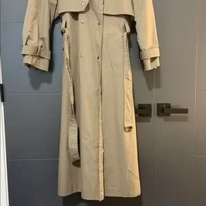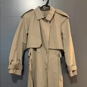 Elevate your style with this classic tan trench coat. Perfect for any occasion, this coat offers both elegance and functionality.