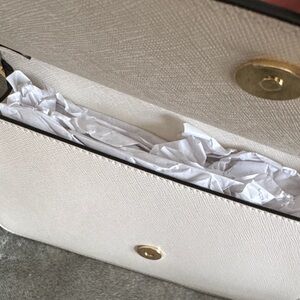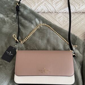 Stylish Kate Spade crossbody with a sleek tan and cream look. Features a luxurious gold chain accent. Perfect for any outing.