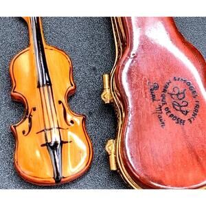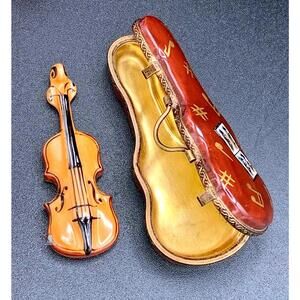 Authentic Rochard Limoges trinket box featuring a beautifully hand-painted violin with matching violin case, crafted in fine French porcelain and finished in the traditional Peint Main technique. This elegant miniature captures rich wood tones, delicate string and f-hole detailing, and a coordinating hinged case decorated with musical motifs.