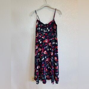 Chic floral dress with navy, red and purple hues. Classic vintage cut with cute tie detail in the sweetheart top. Button detail on front of the dress. Adjustable straps and elasticized back (waist has no elasticity).