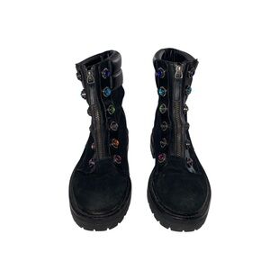 Black suede and leather boots with multicolor stones. In great used condition. Some normal signs of wear. Please note - some stones are missing but its not noticeable some are missing unless looking very close. The zippers is fully functional however there is slight friction when you get to the top (will fully zip)
