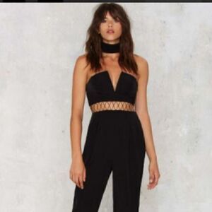 The glory days start with this babe of a jumpsuit. It's black and features a strapless design, plunging sweetheart neckline, cutout with string detail under chest, enclosed zipper at side, and tapered silhouette. Partially lined.