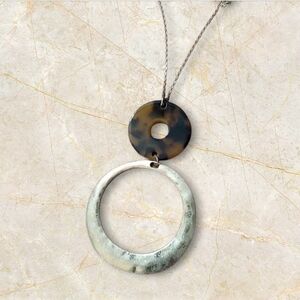 This chic necklace showcases a stylish hammered ring and faux Tortoise shell circle pendant, perfect for enhancing any ensemble with a modern touch.