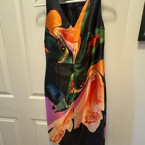 Striking midi dress with vivid floral design. Sleeveless and chic. Perfect for any occasion.