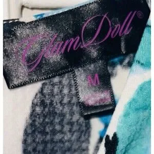 Glam Doll dress in a bright black, turquoise and white floral pattern. It is a zip back, cap sleeves and stylish neck and side cut outs for a peek a boo look. It has stretch, is in great preowned condition and a womens size M.