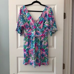 Lilly Pulitzer Parigi romper with crossover V neck (front and back), waist defining band and flowy sleeves plus hidden shorts underneath.