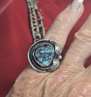 * The turquoise stone has lost it's sawdust backing over time, and sits loosely in the bezel. New owner needs to take to qualified jewelry for eay fix.