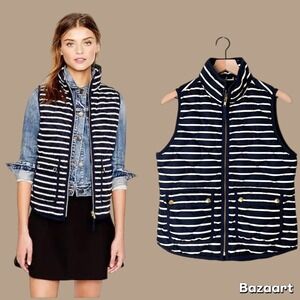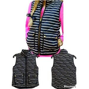 J. Crew Quilted Puffer Vest Down Filled Navy Blue White Stripe Gold Preppy Small